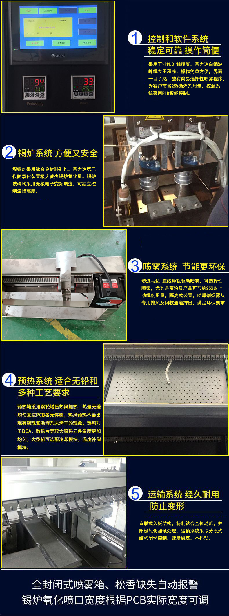 1、智能檢測(cè)系統(tǒng),PCB板進(jìn)入助焊劑噴霧區(qū)和錫爐焊接區(qū),自動(dòng)開始噴霧和焊接,完畢后自動(dòng)停止,為客戶減少25%電能和助焊劑,錫條的用量
