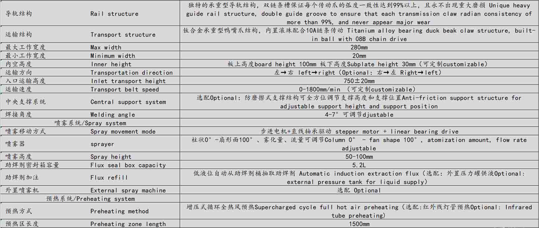 ● 獨(dú)特的承重型導(dǎo)軌結(jié)構(gòu),滾珠鏈條配合上下雙導(dǎo)槽保證每個(gè)傳動(dòng)爪的弧度一致性達(dá)到99%以上,可滿足高要求、重型產(chǎn)品、治具的過爐要求,運(yùn)輸時(shí)元器件無抖動(dòng),可承重100KG不變形不磨損