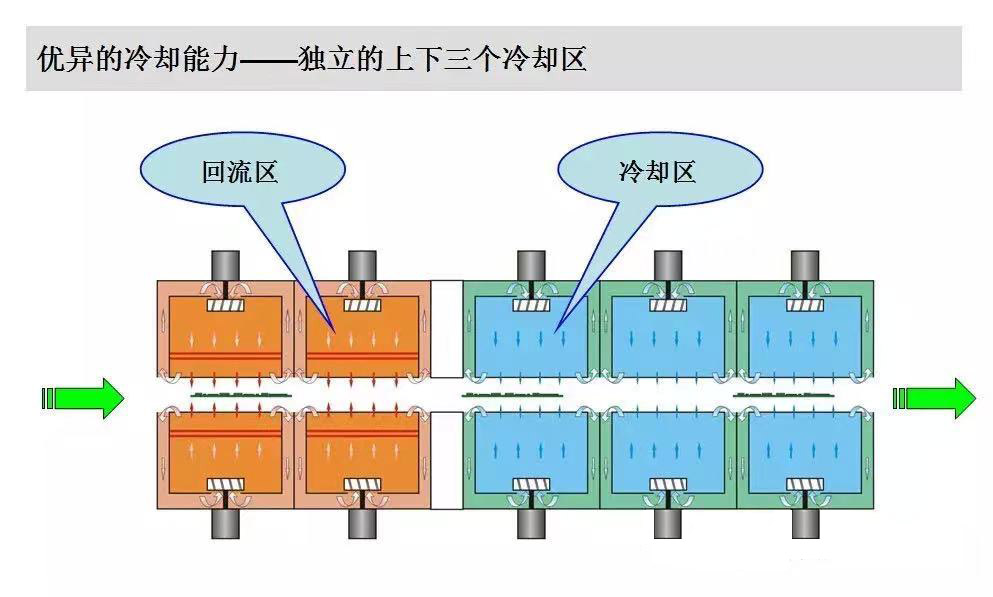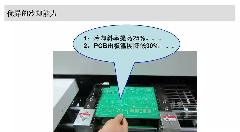 4、冷卻效率:冷卻區(qū)的冷速度,回流焊出口處PCB板的溫度。