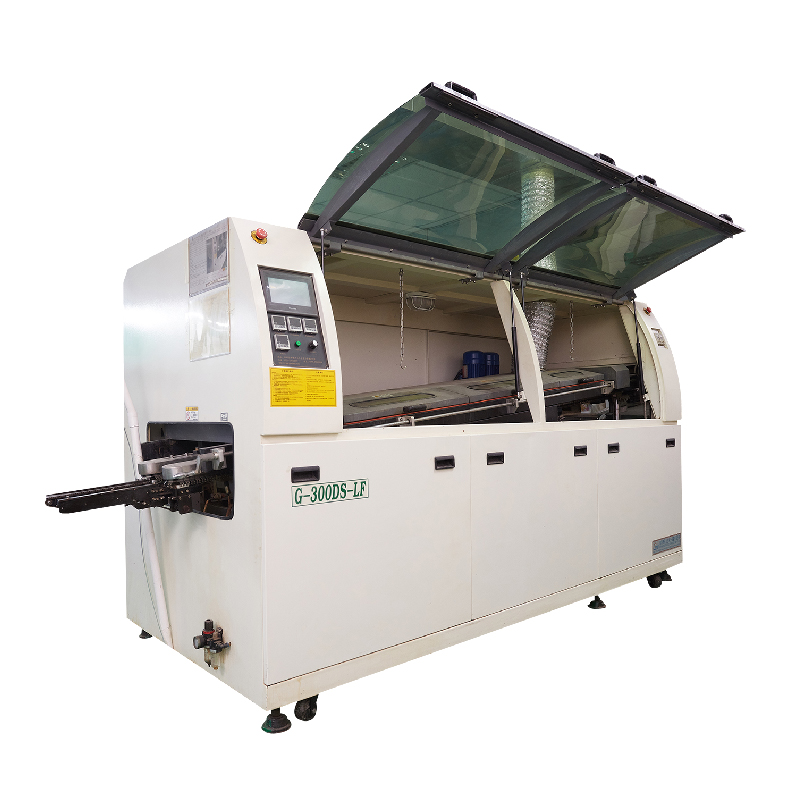 波峰焊錫機的焊接表面與高溫液態錫直接接觸。材料為錫銀銅合金,溫度的設定也是焊料的熔化階段。波峰焊錫機是使插板的焊接表面直接與高溫液態錫接觸,從而達到焊接的目的。高溫液態錫保持一定的坡度,液態錫通過特殊裝置形成類似于波浪的通道,因此波峰焊錫機的主要部分是波浪焊接爐。