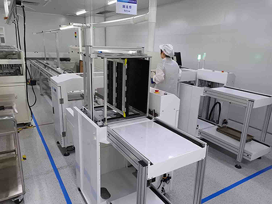 惠倫晶體晶振烤膠車間內場景(拍攝照片經由客戶同意)                    自動上下料機+雙軌道回流焊雙倍產能