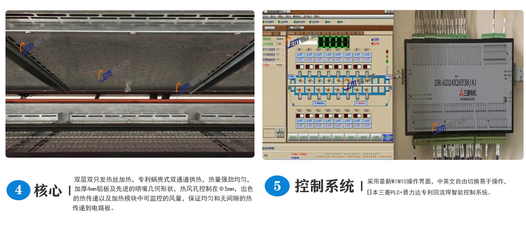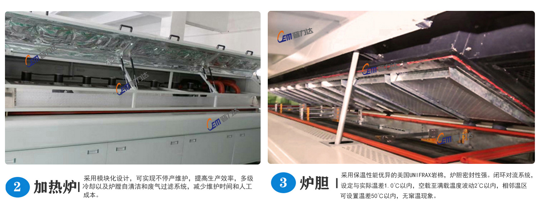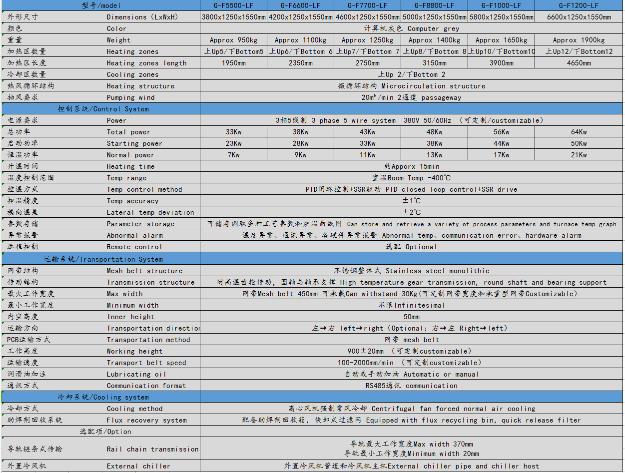 2、采用瑞士CARLO(佳樂)大電流固態繼電器無觸點輸出,安全、可靠,結合溫控器特有的模糊控制功能,一直監視外界溫度及熱量值的變化,以低脈沖控制發熱器件,快速作出反應,保證溫控精度±1℃,機內溫度分布誤差在±2℃以內,長度方向溫度分布符合IPC標準