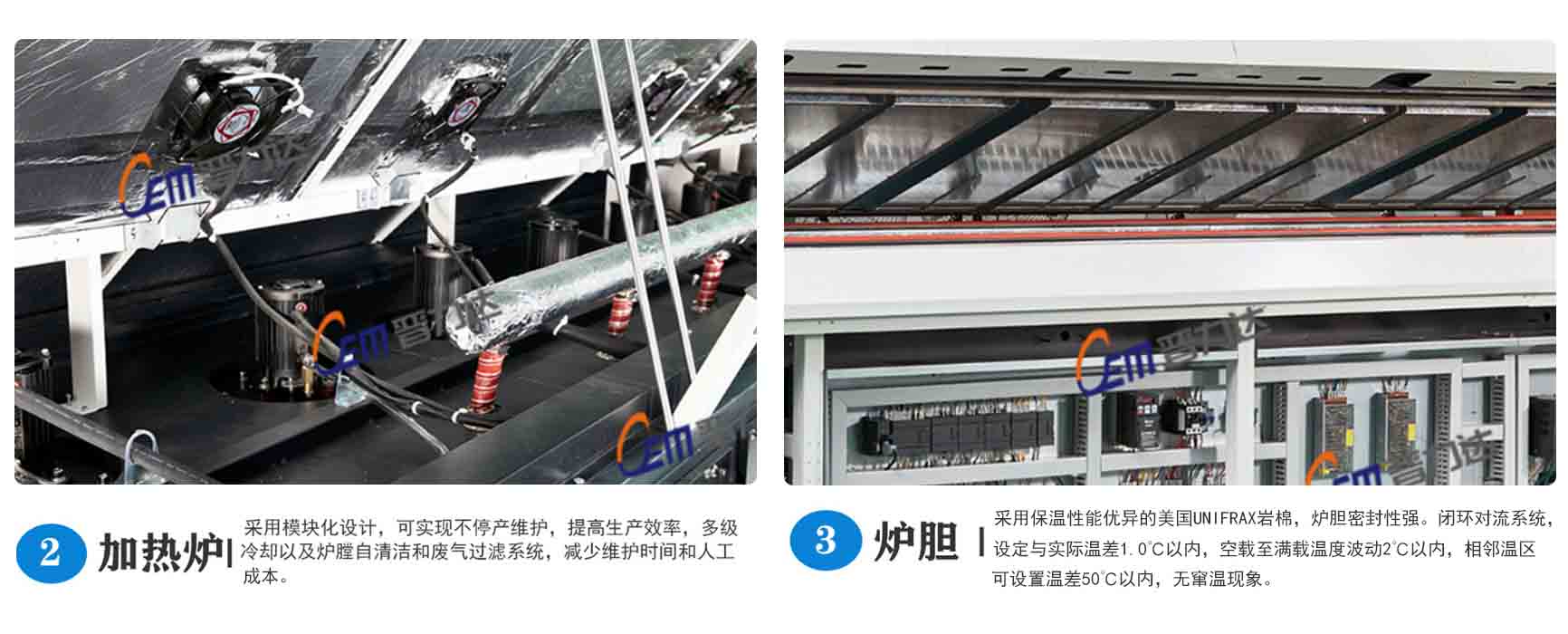 ●全程氮氣定量可控,配置靜氧監測和控制系統,N2低至12m3/min,各溫區通過能量優化的電機獨立閉環控制,爐內殘氧含量低至800-2500ppm,具有最低 CO2 的節能系統
